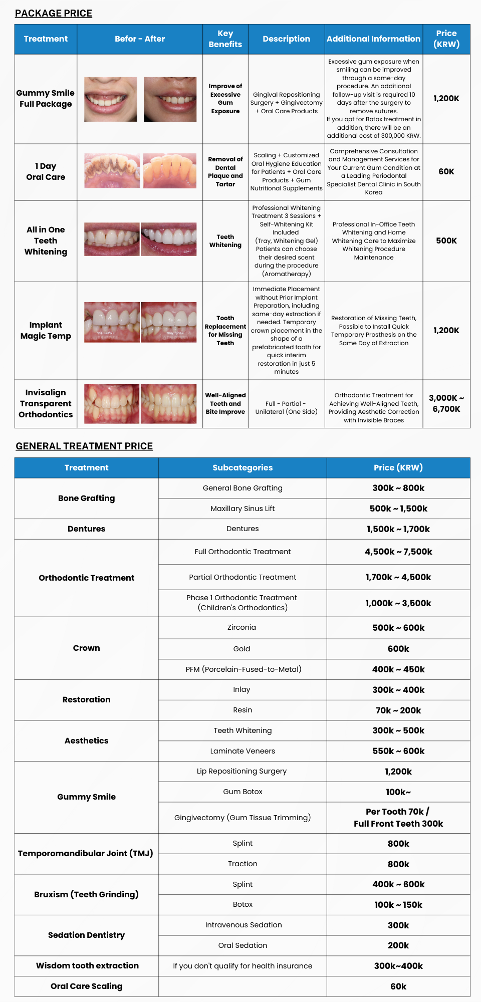 - Convenient Locations: Dental clinics are often located in central and easily accessible areas, such as Gangnam, Myeongdong, Hongdae, Shinchon, Jamsil.